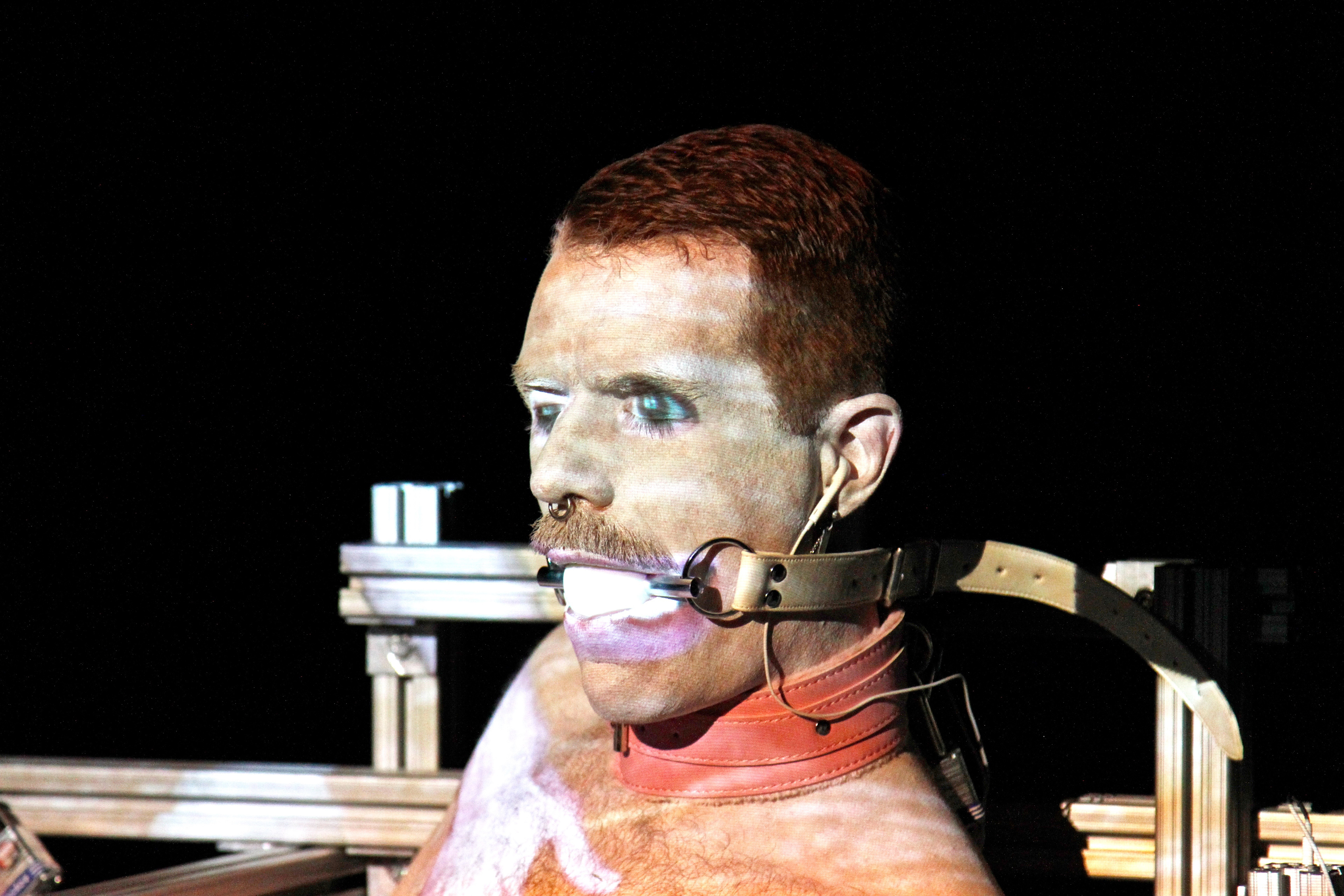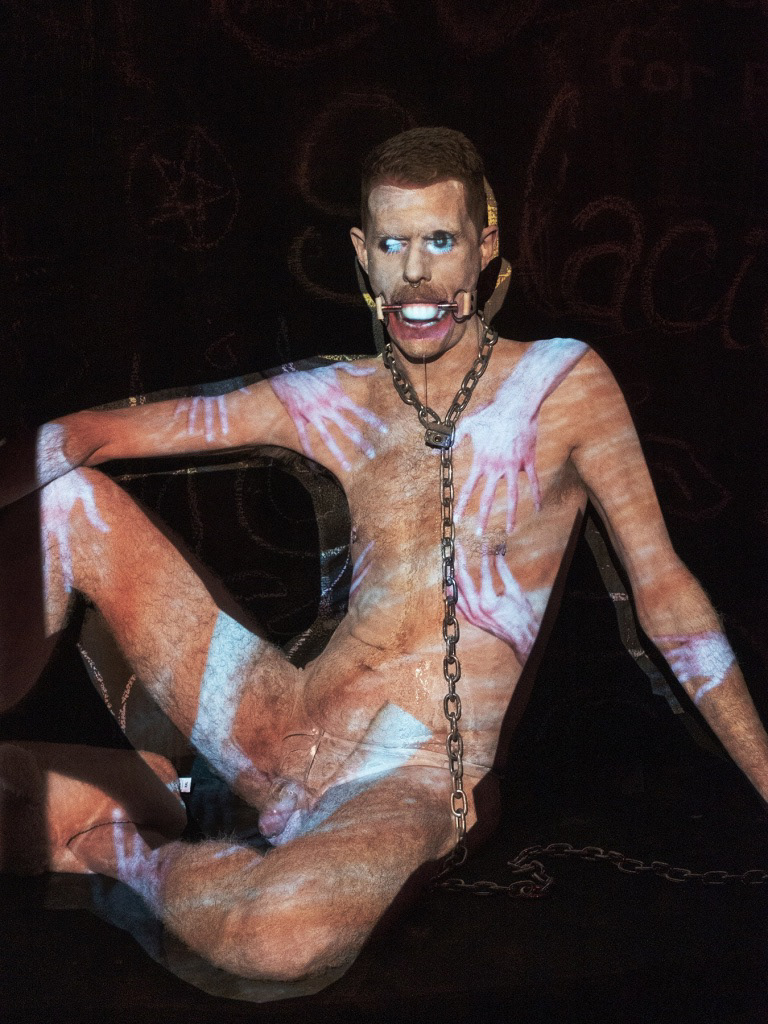 For 𝙊𝙙𝙖𝙡𝙞𝙨𝙦𝙪𝙚, Clough complicates this set of relations by creating a piece of bondage furniture that restrains his body in a seductively asymmetrical form. While his physical body is restrained and his mouth gagged, digital projections of his hands and face, actively moving and speaking, reinscribe his subjectivity and his power. Clough’s words, alternately political, poetic, narrative and analytical, blend seamlessly with music and sound scapes by noise artist Peter Kalisch. A figure representing the Dom, played by performance artist Adam Liam Rose, wears a digitally reproduced mask of Clough’s face. Together, this sensuous and haunting work takes on the seeming contradictions within the queer submissive consciousness: experiencing restraint as comforting, experiencing humiliation as affirming, experiencing exposure as a kind of armor, and experiencing bondage as freedom.